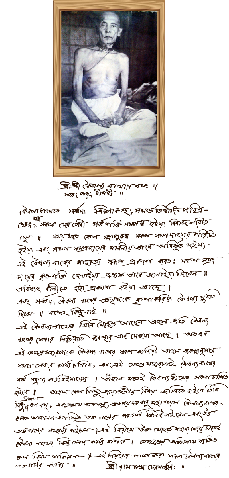 শ্রীরামচন্দ্রদেবশর্ম্মণ অর্থাৎ শ্রীশ্রীরামঠাকুর নির্দেশিত শ্রীশ্রীকৈবল্যনাথের ভক্তগণের কর্তব্য সম্বলিত পত্র সংযোজিত হইল।